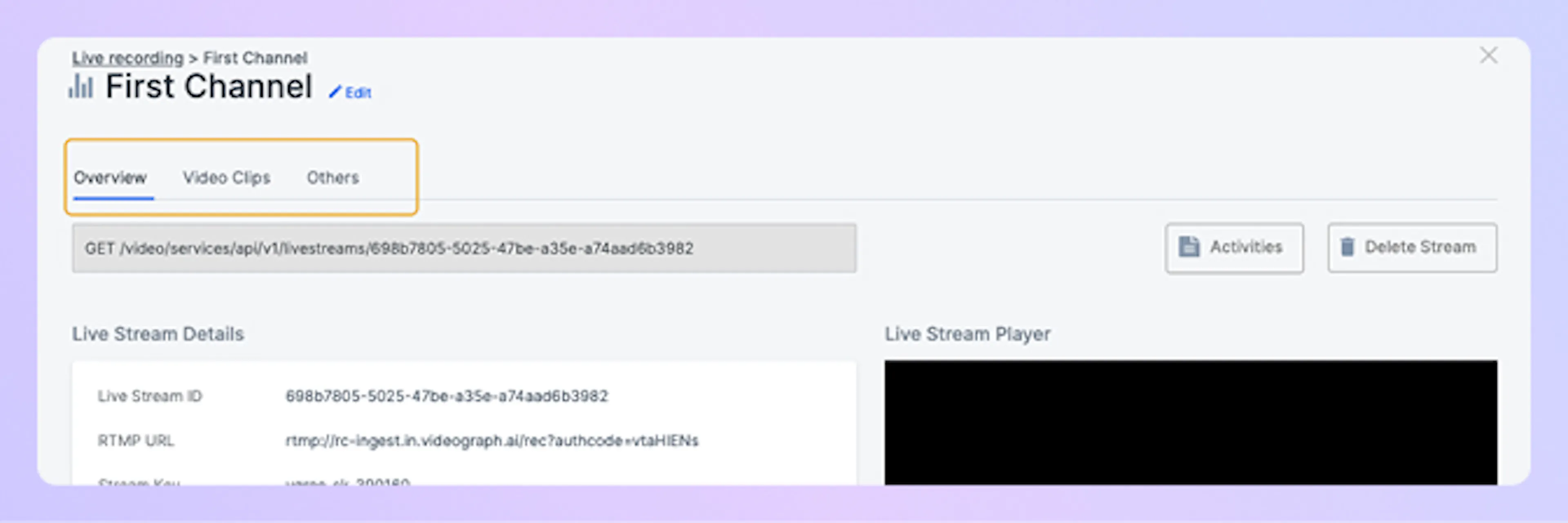 You can also manage the live stream and recorded sessions from the dashboard's Live Stream or Live Recording menus, including clips, metadata, and lifecycle actions.