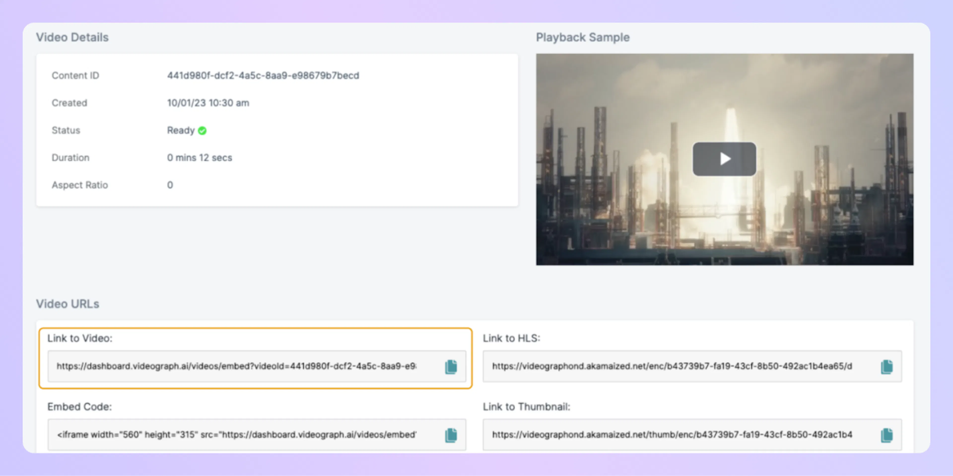 After you create on-demand or live content, Videograph returns playback information that you can embed directly in any web or app player. VOD creation responses include a playback ID or a ready HLS playback URL. Live stream creation responses include fields such as playbackUrl, rtmpUrl, streamKey, and status.